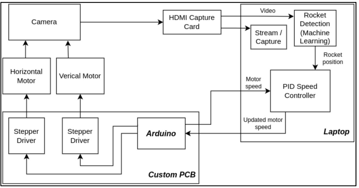 Built a two-axis camera platform that uses machine vision to keep a rocket centered in frame during launch. The system detects the rocket in live video, predicts motion to offset latency, and commands stepper-driven azimuth and elevation for smooth tracking. I led mechanisms and system layout, controls integration, and tuning.